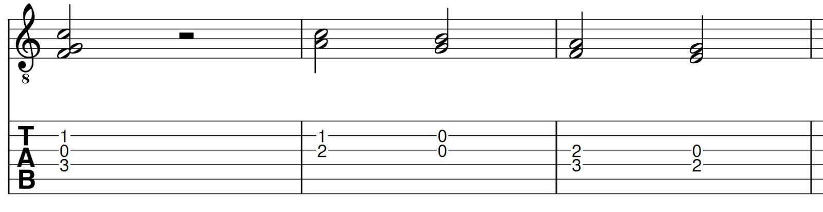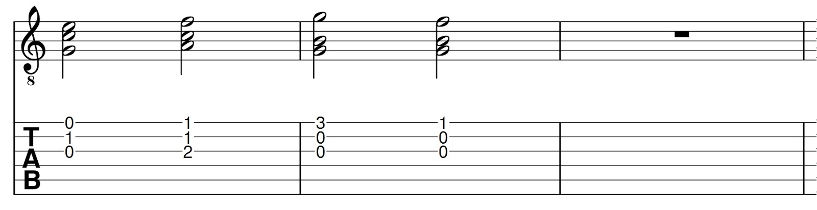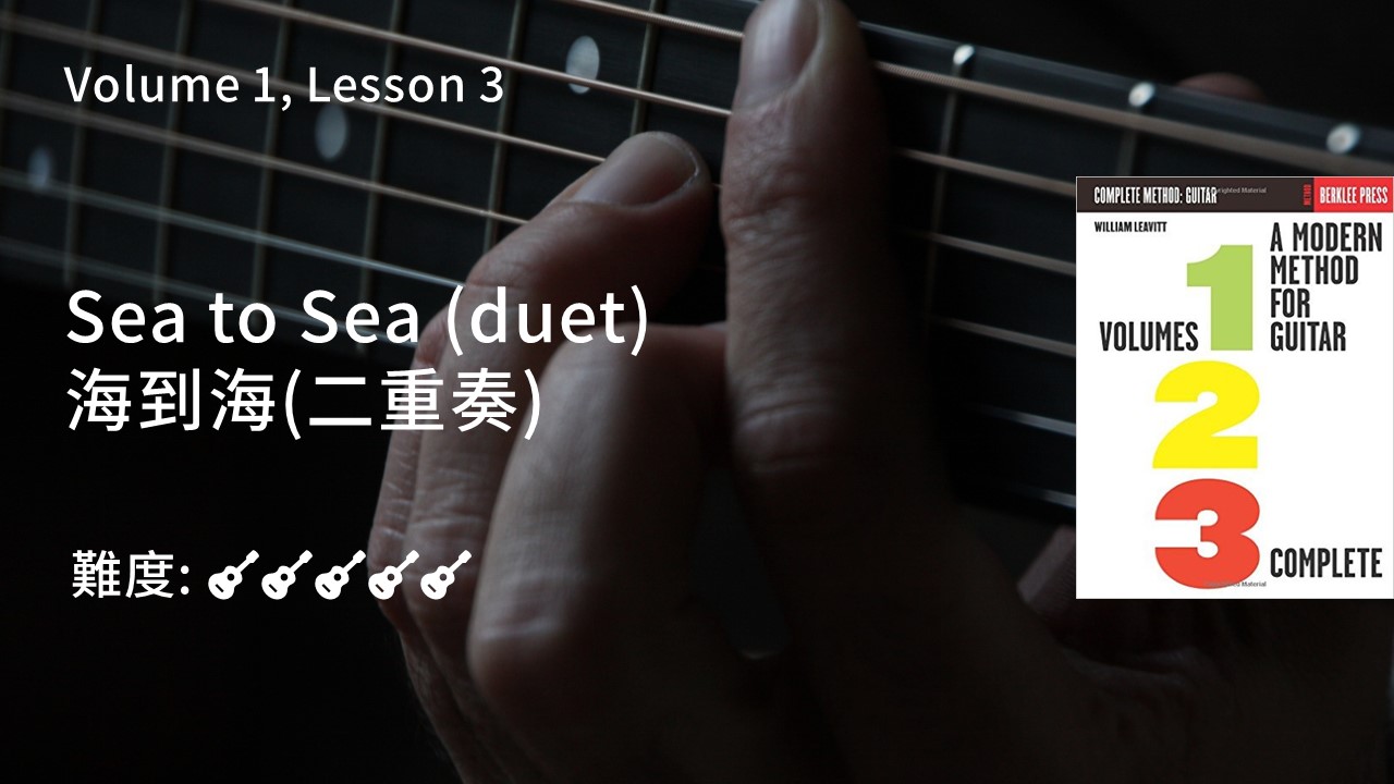 這一課可以說是第一個大障礙,但是撐過去後真的會很輕鬆,現在要用前面學到的單音和和弦用視譜演奏出一首曲子,這首是二重奏,兩把吉他的聲部都需要練習。